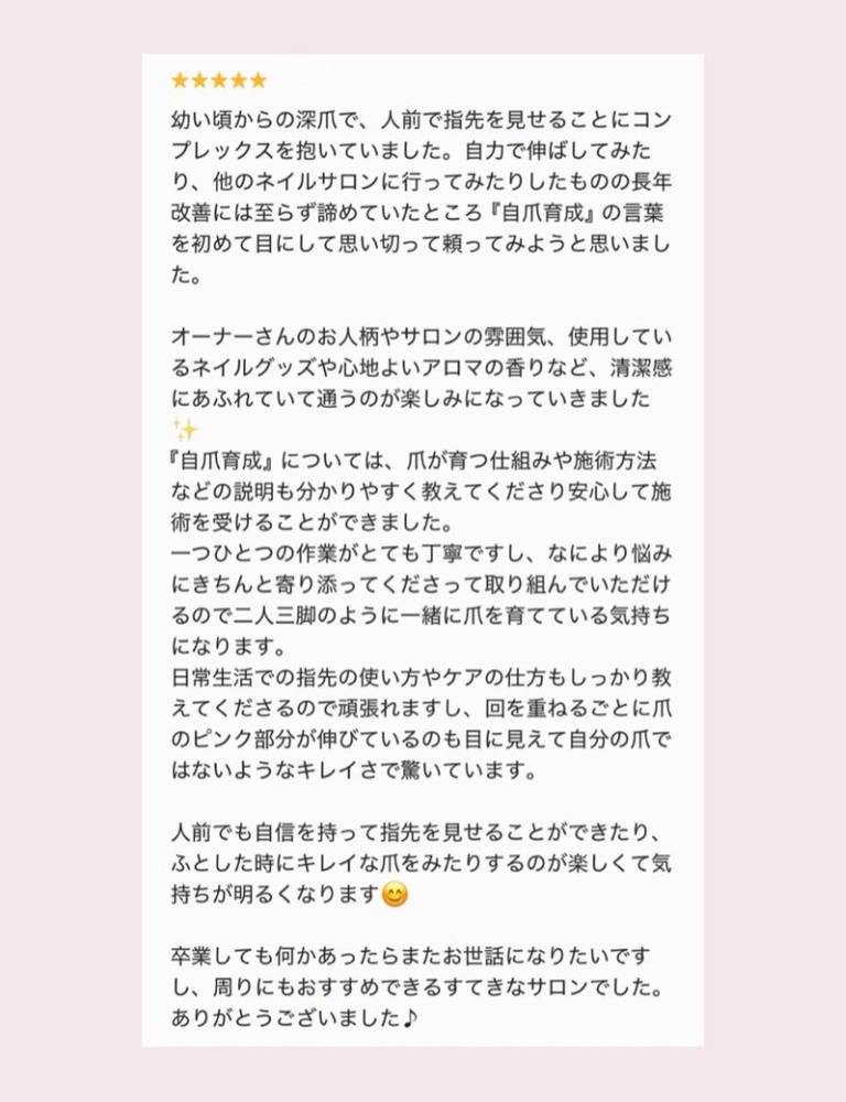 他のネイルサロンに行ってみたり自宅で何かやってみたりしたものの続かず、当サロンを見つけてくださいました✨