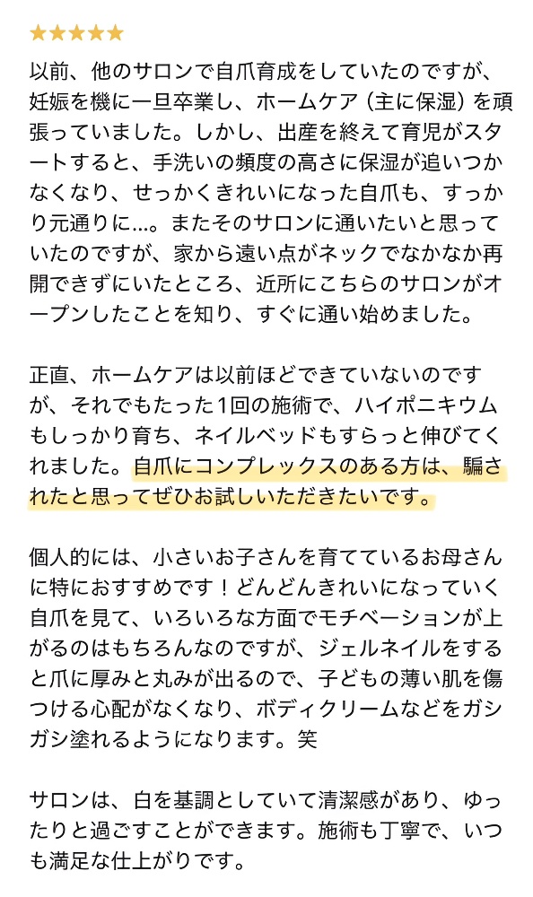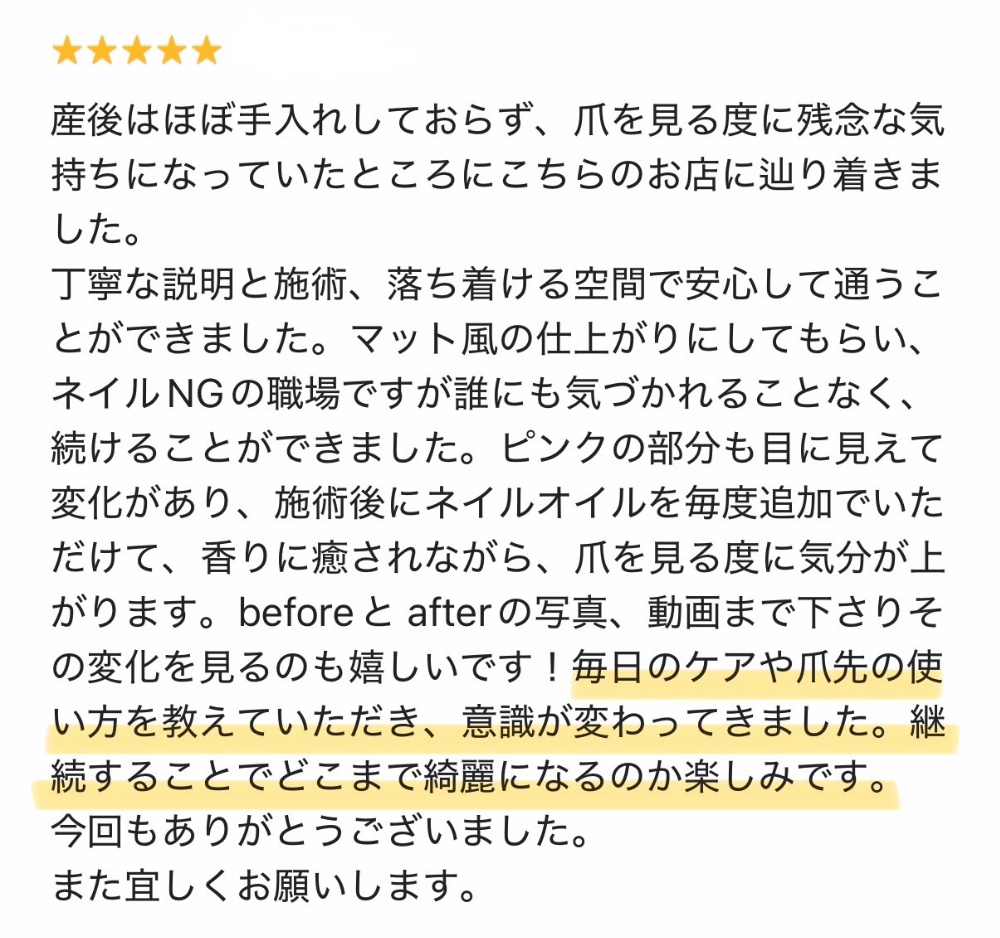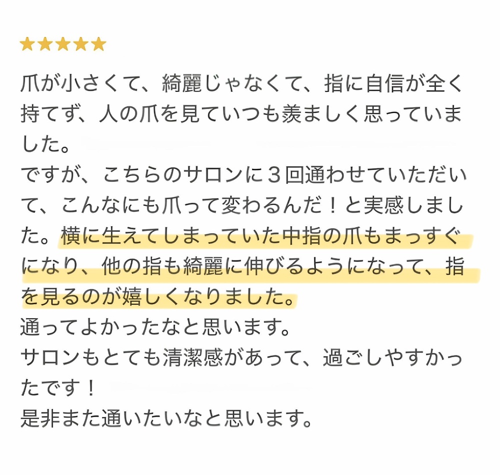 ぜひ、騙されにきてください♡笑やっぱり最初はみなさま「本当にキレイになるの?」という半信半疑な方がほとんどなんです!ですが、お爪がどんどんキレイになっていくと「自爪育成はじめてよかった」とみなさま口を揃えて言ってくださいますこれをご覧になっているあなたも、一歩踏み出してみませんか?