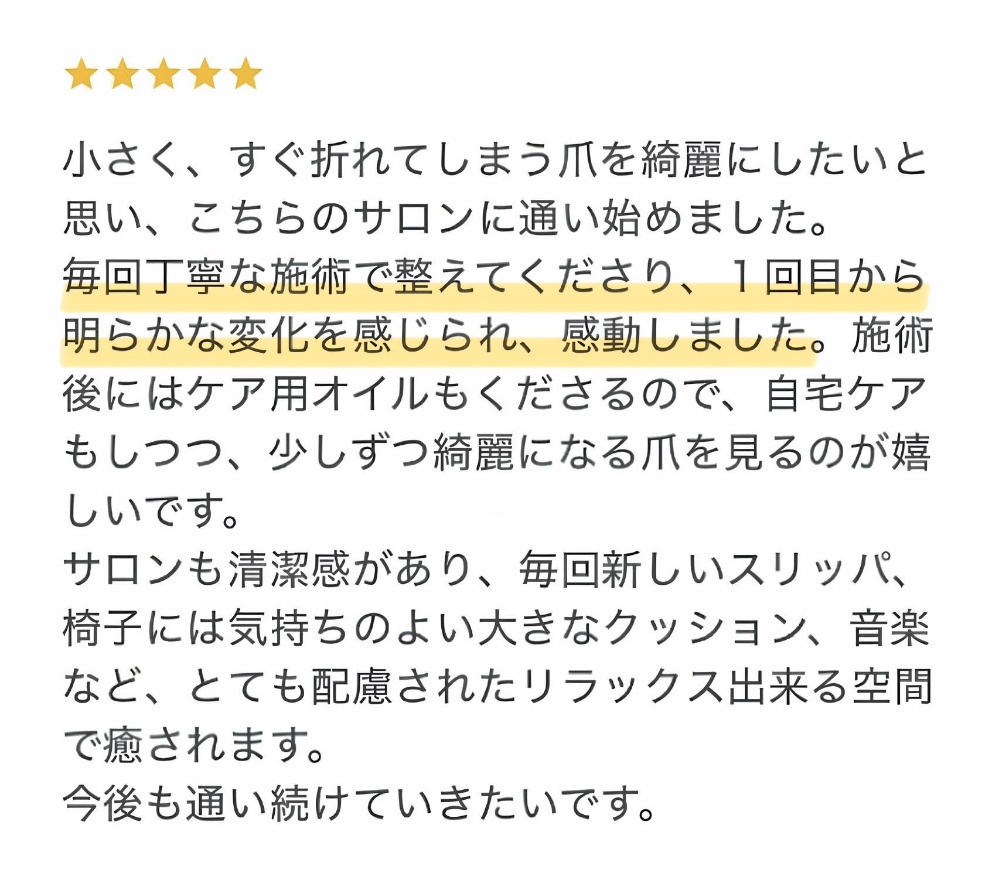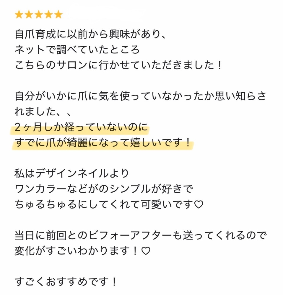 自爪育成に興味を持っていただき、数あるサロンの中から見つけていただけてとても嬉しいです!2ヶ月で変化を実感していただけて何よりです✨これからも一緒に綺麗なお爪を育てていきましょう🌿
